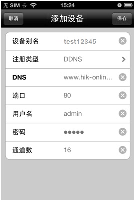 打開iVMS-4500手機客戶端,進入“設(shè)備管理”界面添加設(shè)備。設(shè)備別名處輸入注冊的設(shè)備域名(例如test12345),注冊類型選擇DDNS,DNS地址默認為www.hik-online.com,端口為80(固定填寫),輸入設(shè)備用戶名密碼,保存之后即可進入預(yù)覽界面預(yù)覽。
